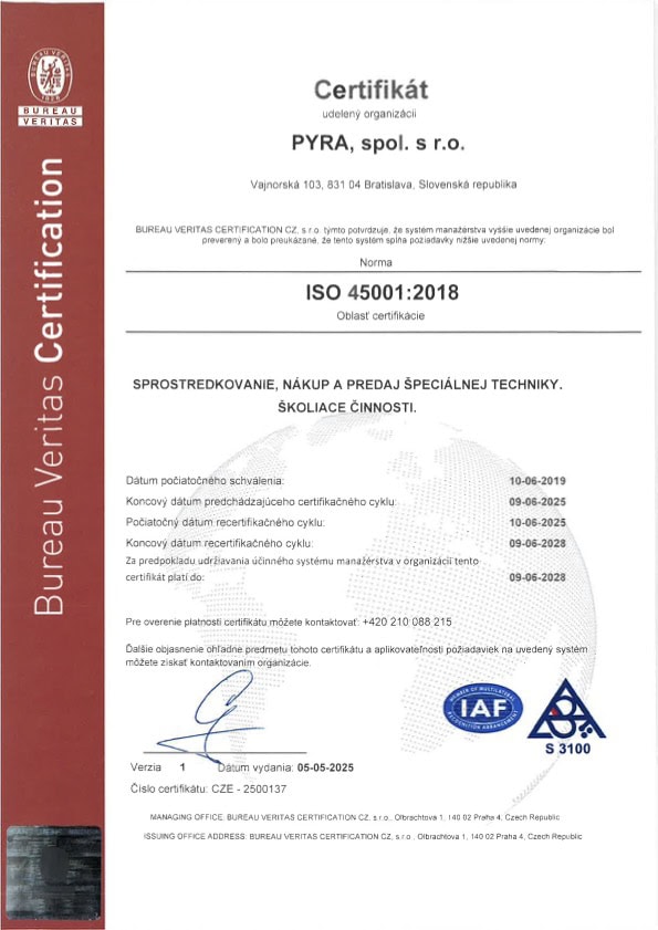 Spoločnosť PYRA, spol. s r.o. je držiteľom certifikátov ISO 9001:2015, ISO 14001:2015, ISO 45001:2018.