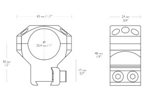 TACTICAL RING MOUNTS 1” 2 PIECE 9-11mm HIGH (24102). 2 dielna hliníková montáž 25,4mm Vysoká (9-11mm / 3/8”). Vlastnosti: Trojité Torx /skrutky, ktoré udržia Váš puškohľad pevne na svojom mieste. Navrhnuté pre uchytenie na 9-11mm základňu. Matný čierny eloxovaný vysoko kvalitný hliník. Vnútorná výstelka zabraňuje značeniu a poškodeniu. Obojstranná bočnica pre koľajnice 9-11 mm alebo 3/8 ". Prevedenie – Dva kusy. Veľkosť otvoru (Priemer) – 25,4mm / 1”. Výška – High (Vysoká). Základňa / kolajnička – 9-11mm / 3/8” rybina. Uchytenie (základňa / vrchná časť) – Dvojité / Trojité Torx skrutky. Vnútorná páska – Áno. Vysúvací dorazový kolík – Áno. Výška – 48mm. Váha – 125g. Kompatibilná s: 22153 HAWKE Picatinny Ring Caps (1", triple screw).