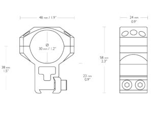 TACTICAL RING MOUNTS 30mm 2 PIECE 9-11mm EXTRA HIGH (24108) 2 dielna hliníková montáž 30mm Extra Vysoká (9-11mm / 3/8”). Vlastnosti: Trojité Torx skrutky, ktoré udržia Váš puškohľad pevne na svojom mieste. Navrhnuté pre uchytenie na 9-11mm základňu. Matný čierny eloxovaný vysoko kvalitný hliník. Vnútorná výstelka zabraňuje značeniu a poškodeniu. Obojstranná bočnica pre koľajnice 9-11 mm alebo 3/8 ". Prevedenie – Dva kusy. Veľkosť otvoru (Priemer) – 30mm. Výška – Extra High (Extra Vysoká). Základňa / kolajnička – 9-11mm / 3/8” rybina. Uchytenie (základňa / vrchná časť) – Dvojité / Trojité Torx skrutky. Vnútorná páska – Áno. Vysúvací dorazový kolík – Áno. Výška – 58mm. Váha – 137g. Kompatibilná s: 22154 HAWKE Picatinny Ring Caps (30mm, triple screw).
