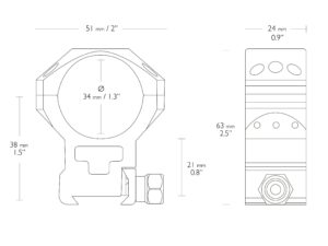 TACTICAL RING MOUNTS 34mm 2 PIECE WEAVER HIGH (24120) 2 dielna oceľová montáž 34mm Vysoká (Weaver). Šesťhranný maticový model. Vlastnosti: Trojité Torx skrutky, ktoré udržia Váš puškohľad pevne na svojom mieste. Matný čierny eloxovaný vysoko kvalitný hliník. Vnútorná výstelka zabraňuje značeniu a poškodeniu. Prevedenie – Dva kusy. Veľkosť otvoru (Priemer) – 34mm. Výška – High (Vysoká). Základňa / kolajnička – Weaver. Uchytenie (základňa / vrchná časť) – Dvojité / Trojité Torx skrutky. Vnútorná páska – Áno. Vysúvací dorazový kolík – Áno. Výška – 63mm. Váha – 172g.