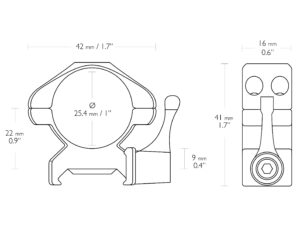 PRECISION STEEL RING MOUNTS 1” 2 PIECE WEAVER MEDIUM - LEVER (23011) 2 dielna oceľová montáž 25,4mm Stredná (Weaver) – Páčka. Rýchlo upínací model. Vlastnosti: Dvojité Torx skrutky, ktoré udržia Váš puškohľad pevne na svojom mieste. Navrhnuté pre uchytenie na Weaver/Picatiny koľajničku. Kvalitná oceľová konštrukcia. Prevedenie – Dva kusy. Veľkosť otvoru (Priemer) – 25,4mm / 1”. Výška – Medium (Stredná). Základňa / kolajnička – Weaver. Uchytenie (základňa a vrchná časť) – Dvojité Torx skrutky. Vnútorná páska – Nie. Vysúvací dorazový kolík – Nie. Výška – 41mm. Váha – 159g.