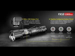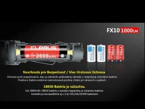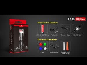 Súčasťou balenia je: Svietidlo FX10, Mikro-USB nabíjací kábel, šnúrka na zápästie, puzdro na svietidlo, klip, O-krúžky – 1ks, Klarus 18650BAT-26 (LiR 3,7V 2600mAh nabíjateľná).