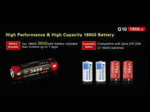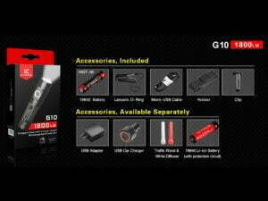 Súčasťou balenia je: Svietidlo G10, Klarus 18650 3600mAh nabíjateľná batéria (18GT-36), O-krúžok – 1ks, šnúrka na zápästie, Mikro-USB nabíjací kábel, Puzdro, Klip na opasok.