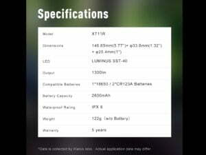 Súčasťou balenia je: Svietidlo XT11R, šnúrka na zápästie, Klip na opasok, na svietidlo, O-krúžky – 2ks, Klarus 18650BAT-26 (LiR 3,7V 2600mAh nabíjateľná), USB nabíjací kábel.