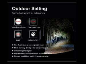 ◇ Nastavenie pre vonkajšie prostredie: Špeciálne vyvinuté pre divočinu. Jedným dotykom Slabý režim (režimový spínač), Jedným dotykom Turbo (hlavný spínač), Viacero úrovní s pamäťou, SOS funkcia. Vhodné pre všetky potreby pri Turistike, Kempovaní a pri Hľadaní a Záchrane.