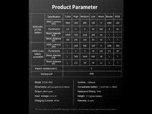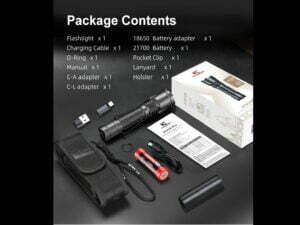 Súčasťou balenia je: Svietidlo XT21X Pro, Mikro-USB nabíjací kábel Typu-C x1, konektor typ A (USB-C na USB-C nabíjanie x1, konektor typ L (USB-C na USB) x1, šnúrka x1, náhradný o-krúžok x1, Klarus 21700 nabíjateľnú batériu (LiR 3,6V 5000mAh 21GT-50) x1, puzdro x1, spona x1, držiak batérie (18650) x1.