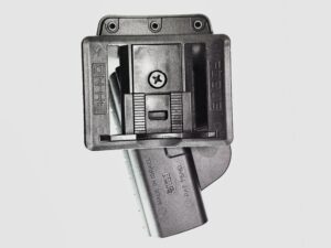 Puzdro má nastaviteľné uchytenie s prevlečením na opasky od šírky 33 mm do 60 mm.