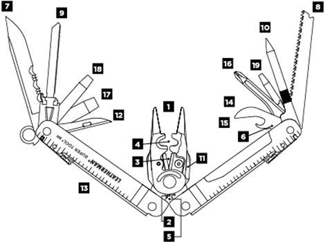 | Súčasť balenia / Funkcie | Kombinované kliešte, Odizolovacia čepeľ, Otvárač na fľaše, Pílka, Pilník, Pravítko, Šidlo, Skrutkovač, Otvárač na konzervy |